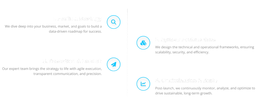We don’t follow templates. We build what works. From business development and fundraising to AI automation and marketing, we deliver full-cycle solutions that bring measurable growth. Book a Consultation Explore Our Cases Why We're Different From business development and fundraising to AI automation and marketing, we deliver full- cycle solutions that bring measurable growth. Services Category Overview Book a Consultation Proven Results, Measurable Growth Explore our portfolio of successful projects. We don’t just talk about results—we deliver them. Each case is a testament to our tailored approach and commitment to client success. Book a Consultation Our Working Logic We follow a structured, four-step process to ensure clarity, efficiency, and exceptional results on every project. Book a Consultation What Our Clients Say Real feedback from real partnerships Tell us about your project Share a few details and we’ll get back to you within 1 business day with next steps.